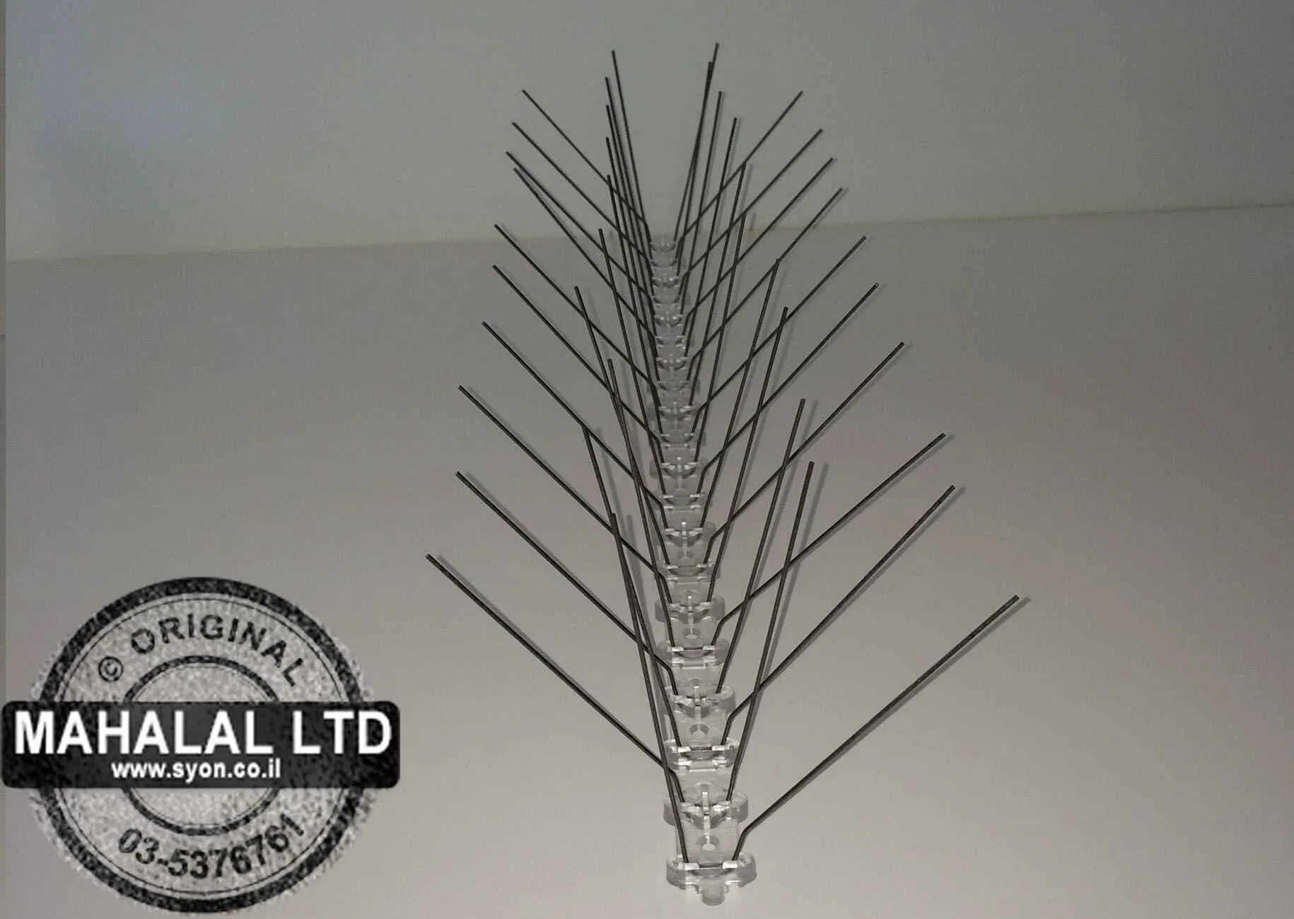 2 שורות דוקרנים עשויים נירוסטה 302 עם בסיס פוליקרבונט מוגן קרינת שמש UV. אורך הבסיס חצי מטר ליחידה, 20 דוקרנים עם רוחב פתרון של 5 ס"מ.
